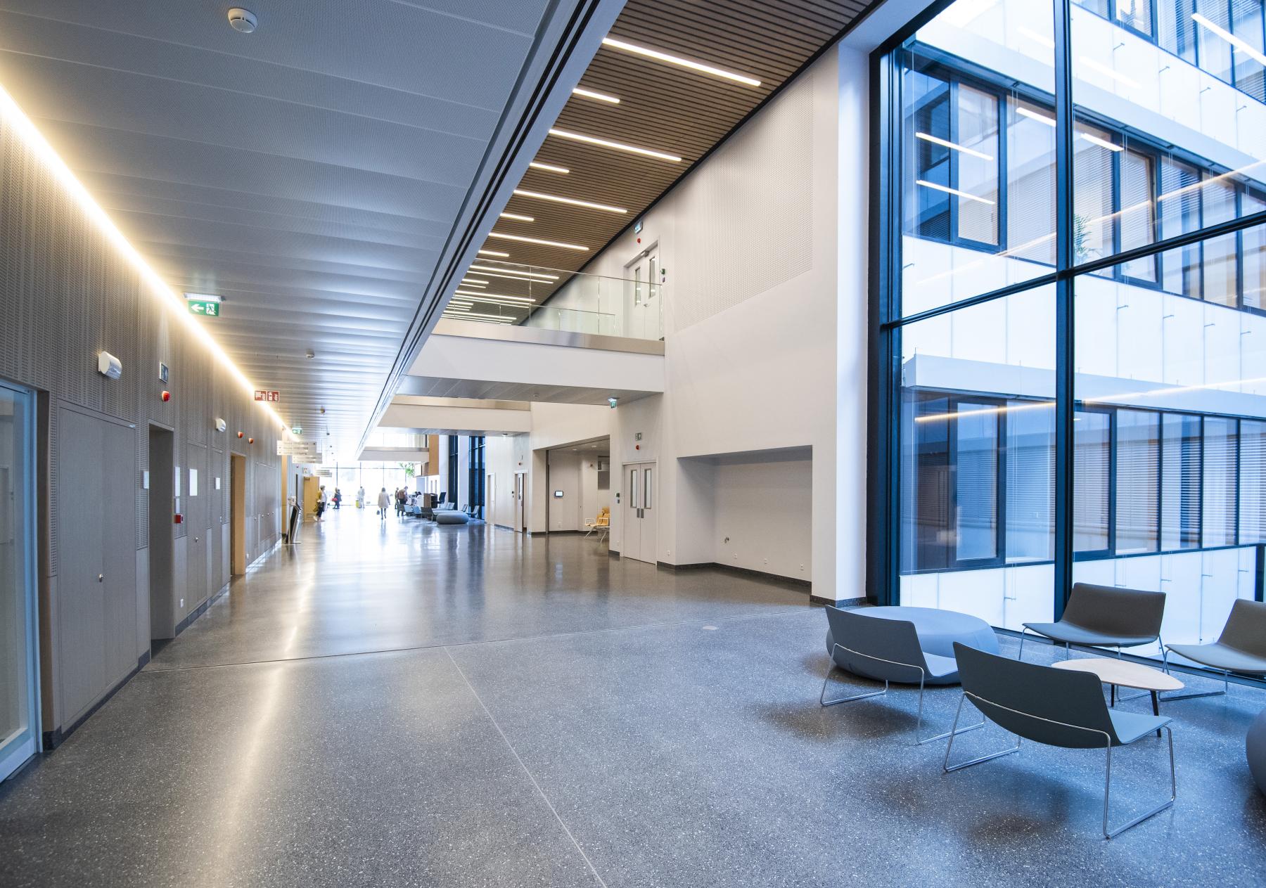 Reúne en un mismo recinto actividades asistenciales (con 250 camas hospitalarias) y de investigación, con un total de 80.000 m2 dedicados a: